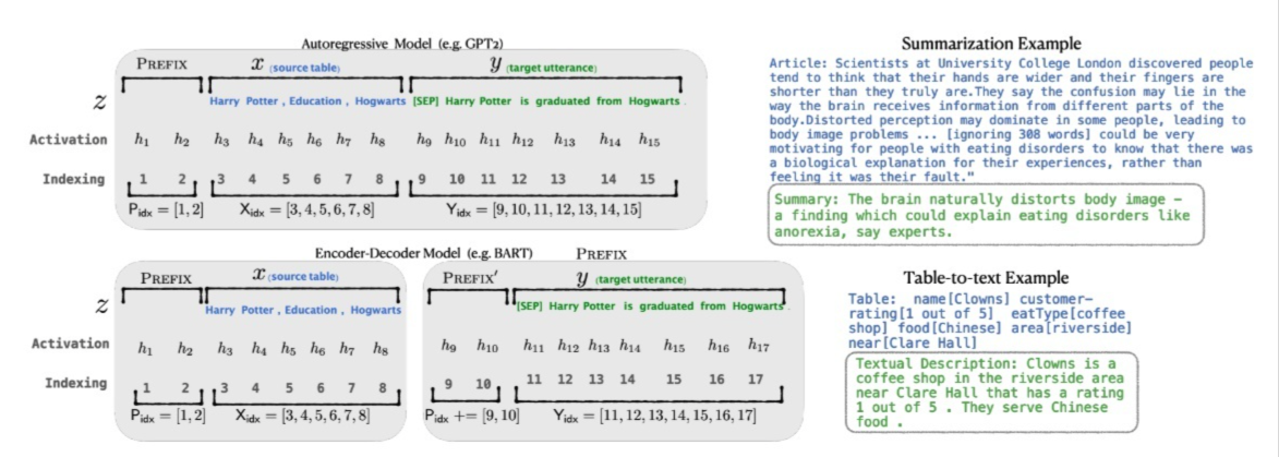 Prefix-tuning 微调方法在模型中加入 prefix,即连续的特定任务向量,微调时只优化这一小段参数。对于条件生成任务,如下图所示,其输入是文本x