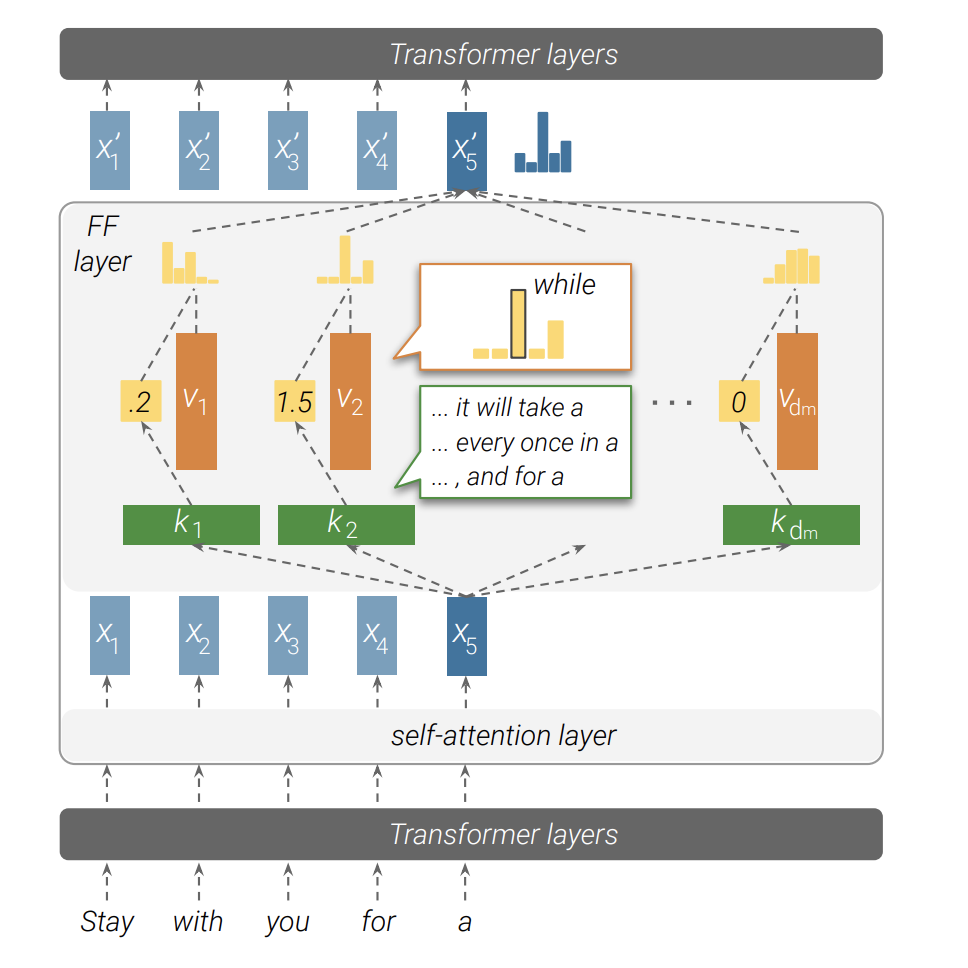 Transformer 的 FF 层可以视为一个 key-value memory,其中每一层的 key 用于捕获输入序列的特征,value 可以基于 key 捕获的特征,给出下一个 token 的词表分布。Transformer 每一层的 FF 层是由多个 key-value 组合而成,然后结合残差连接对每层结果细化,最终产生模型的预测结果。FF 层的公式可以表示为:
