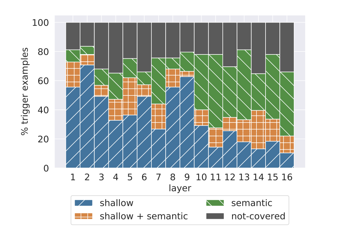 此外,实验表明,Transformer 的浅层倾向于提取出浅层特征,深层倾向于提取语义特征,如下图所示。层数越深提取的语义特征所占的比例越重。