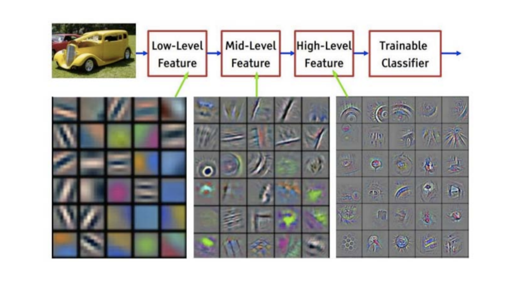 在计算机视觉中,低层的网络主要学习图像的边缘或色斑,中层的网络主要学习物体的局部和纹理,高层的网络识别抽象的语义,如下图所示。因此,可以把一个神经网络分成两块: