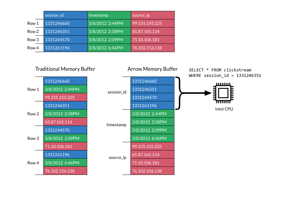 从上图中,我们可以很清晰的看出,传统的内存数据格式,各个字段的分布是以没一行呈现,相同字段并未集中排列在一起。而通过 Arrow 格式化后的内存数据,可以将相同字段集中排列在一起。我们可以很方便的使用 SQL 来操作数据。