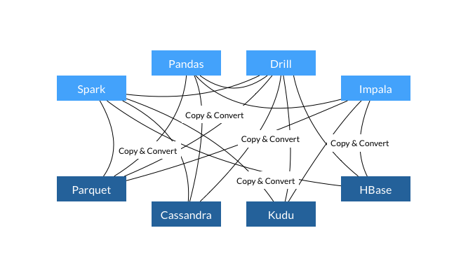 现在大数据处理模型很多,用户在应用大数据分析时,除了将 Hadoop 等大数据平台作为一个存储和批处理平台之外,同样也得关注系统的扩展性和性能。过去开源社区已经发布了很多工具来完善大数据分析的生态系统,这些工具包含了数据分析的各个层面,例如列式存储格式(Parquet,ORC),内存计算模型(Drill,Spark,Impala 和 Storm)以及其强大的 API 接口。而 Arrow 则是最新加入的一员,它提供了一种跨平台应用的内存数据交换格式。