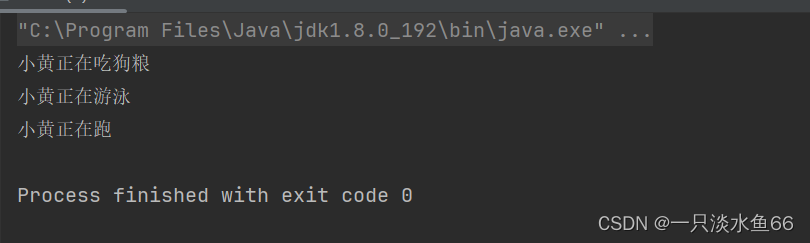 interface Ifly{ void fly(); } interface Irunning{ void running(); } interface Iswimming{ void swimming(); } abstract class Animal{ public String name; public int age; public Animal(String name,int age){ this.name = name; this.age = age; } abstract public void eat(); } class Dog extends Animal implements Iswimming , Irunning{ public Dog(String name,int age){ super(name,age); } @Override public void running() { System.out.println(this.name + "正在跑"); } @Override public void swimming() { System.out.println(this.name + "正在游泳"); } @Override public void eat() { System.out.println(this.name + "正在吃狗粮"); } } public class Data{ public static void test1(Animal animal){ animal.eat(); } public static void test2(Ifly ifly){ ifly.fly(); } public static void test3(Iswimming iswimming){ iswimming.swimming(); } public static void test4(Irunning irunning){ irunning.running(); } public static void main(String[] args) { test1(new Dog("小黄" ,20)); test3(new Dog("小黄" ,20)); test4(new Dog("小黄" ,20)); } }