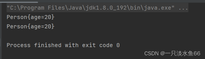 class Person implements Cloneable{ public int age; public Person(int age) { this.age = age; } @Override public String toString() { return "Person{" + "age=" + age + '}'; } @Override protected Object clone() throws CloneNotSupportedException { return super.clone(); } } public class Data{ public static void main(String[] args) throws CloneNotSupportedException { Person p1 = new Person(20); Person p2 = (Person)p1.clone(); System.out.println(p1); System.out.println(p2); } }
