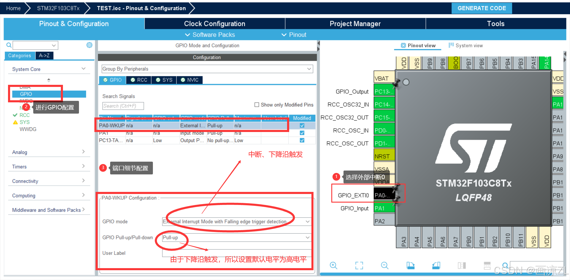 配置中断触发方式:设置外部中断的触发方式(上升沿触发、下降沿触发或上升下降沿触发)。