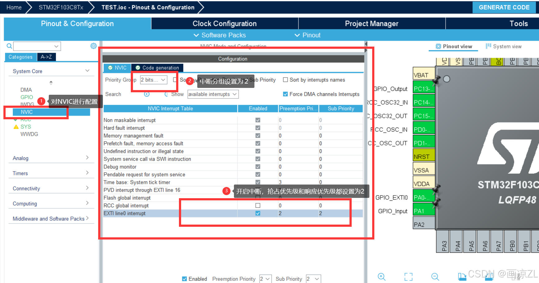 初始化NVIC(嵌套向量中断控制器):配置中断分组,配置中断的优先级和使能中断。STM32支持抢占式优先级和子优先级,可以根据需要配置中断的优先级。