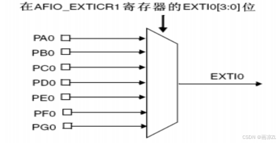 外部的GPIO引脚与线0~15对应,16条中断线都可以映射给GPIO口,但是每条线只能映射给一个个端口,如0线已经映射给 PA0端口,则就不能再映射给Px0端口(x为B、C、D、E、F等),如下图所示: