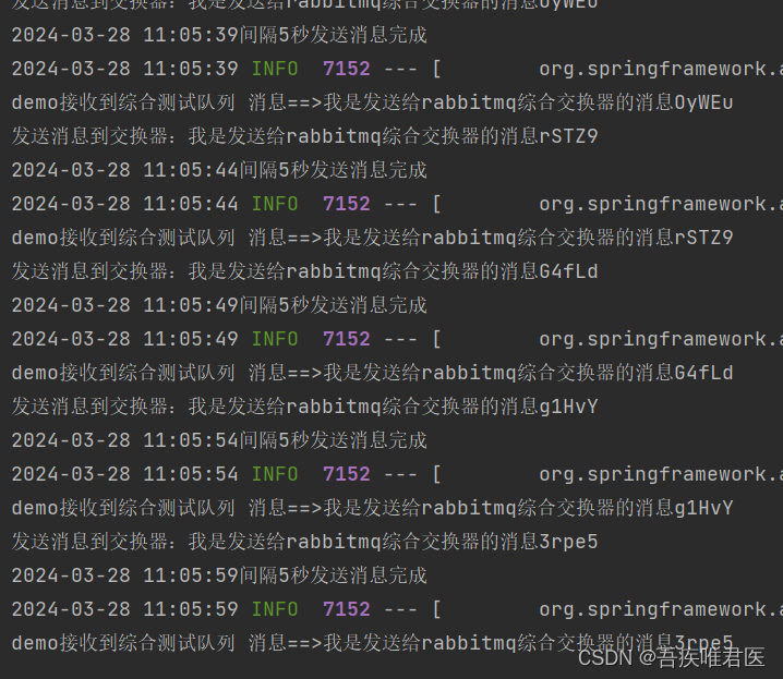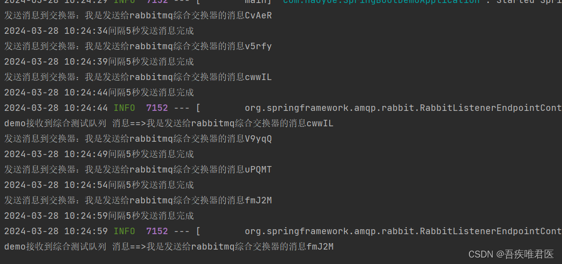 @Autowired private MsgProducer msgProducer; @Scheduled(initialDelay = 5000, fixedRate = 5000) public void test(){ try { msgProducer.sendzongheDirectTestQueue("我是发送给rabbitmq综合交换器的消息"+StringTimeUtil.nonce(5)); System.out.println(StringTimeUtil.now()+"间隔5秒发送消息完成"); }catch (Exception e){ System.out.println("RabbitMQ发送消息异常:"+e.getMessage()); } }