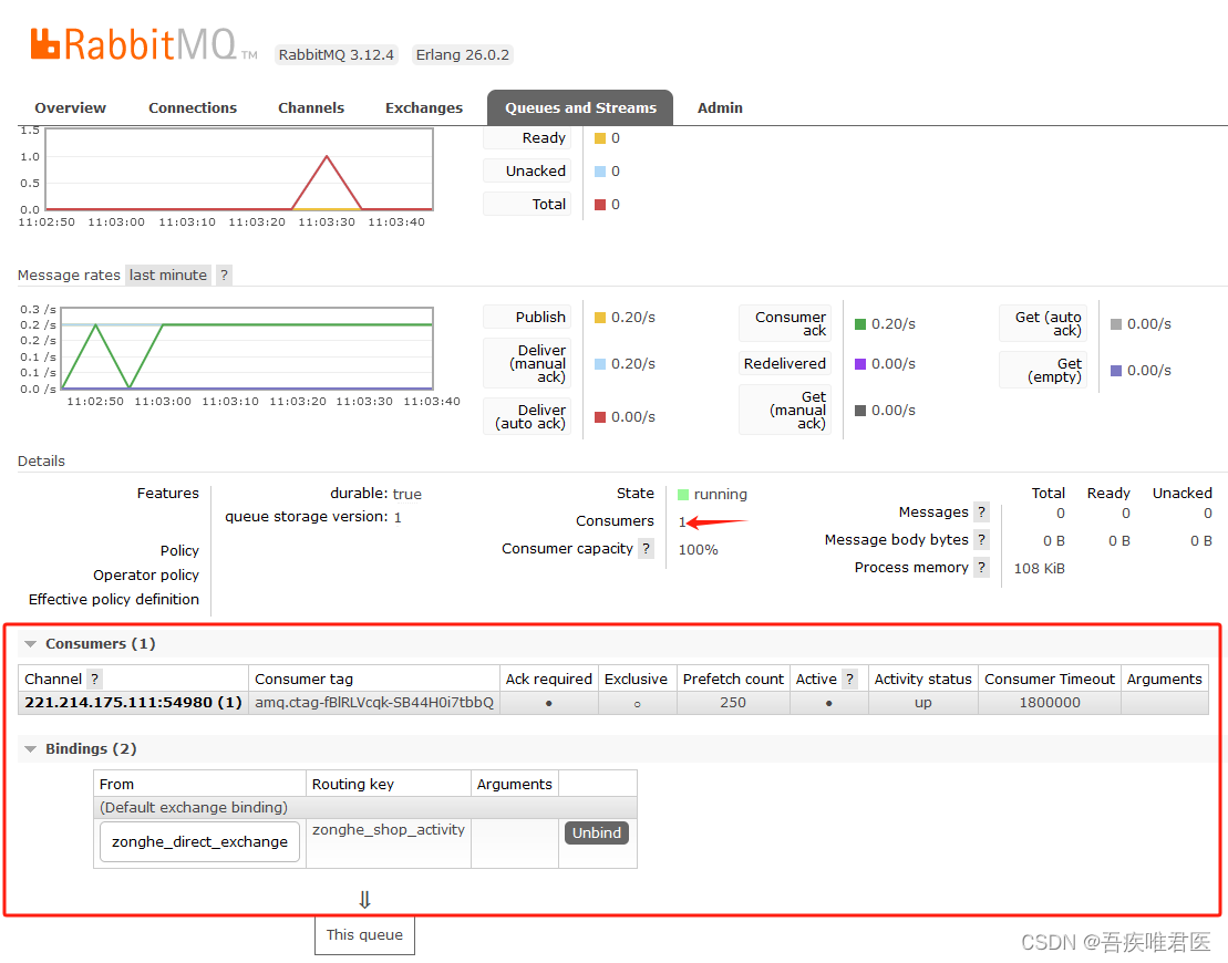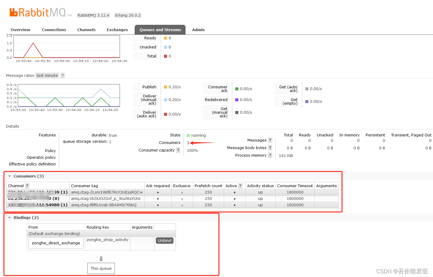 小编发现,关于消息交换器和消息队列绑定也是正常的,也没有发生回传重试,但忽然注意到消息队列的消费者有三个,并且下面的Consumers详细的列出了三个消费者。由此猜想,八成是demo中生产的三条消息,前两条被其他消费者消费掉了,最后一条消息由demo本身的消费者消费了。经过排查测试确实是这样,小编本地开发项目在链接着服务器的RabbitMQ,服务器正运行的项目也在连接着RabbitMQ,加上本地demo正好三个,当把除了demo其他两个服务均关闭后,效果就正常了。