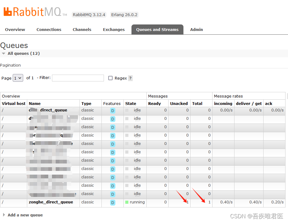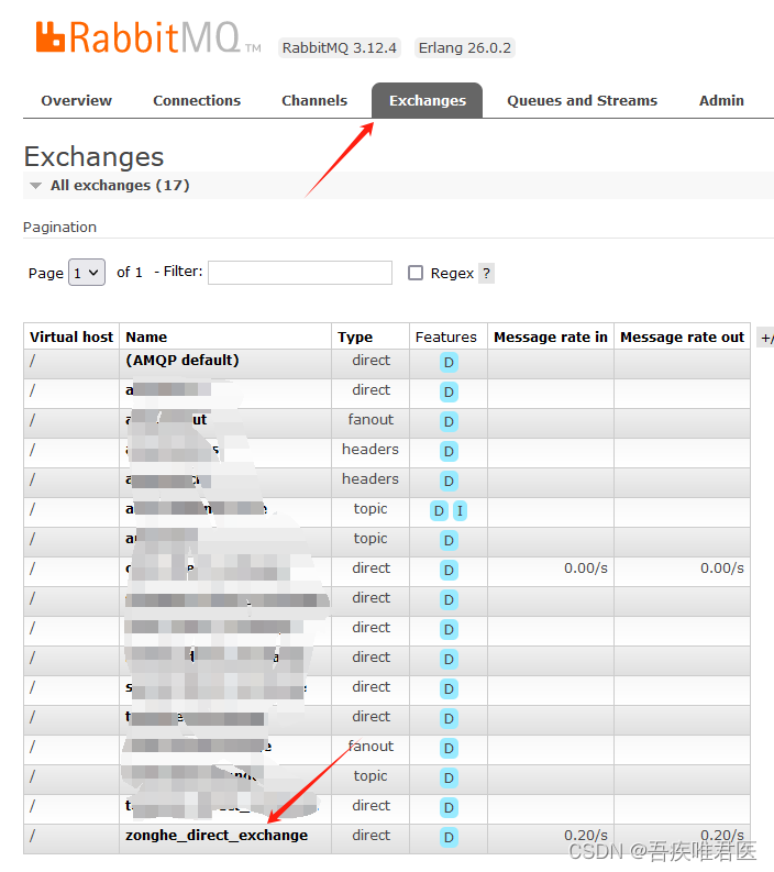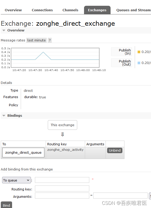 看样子是没什么异常的,交换器是正常创建的,密钥也正确,durable:true状态也正常。然后查看队列。
