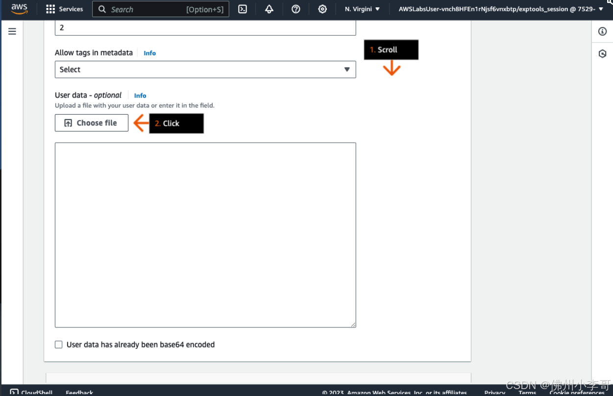 #!/bin/bash sudo yum update -y sudo yum install -y httpd sudo yum install -y git export TOKEN=`curl -X PUT "http://169.254.169.254/latest/api/token" -H "X-aws-ec2-metadata-token-ttl-seconds: 21600"` export META_INST_ID=`curl http://169.254.169.254/latest/meta-data/instance-id -H "X-aws-ec2-metadata-token: $TOKEN"` export META_INST_TYPE=`curl http://169.254.169.254/latest/meta-data/instance-type -H "X-aws-ec2-metadata-token: $TOKEN"` export META_INST_AZ=`curl http://169.254.169.254/latest/meta-data/placement/availability-zone -H "X-aws-ec2-metadata-token: $TOKEN"` cd /var/www/html echo "" >> index.html echo "" >> index.html echo "" >> index.html echo " " >> index.html echo " " >> index.html echo " " >> index.html echo " Amazon EC2 Status " >> index.html echo "" >> index.html echo "" >> index.html echo " " >> index.html echo " " >> index.html echo " " >> index.html echo " Your EC2 Instance is running!" >> index.html echo " " >> index.html echo " " >> index.html echo " Instance Id" >> index.html echo " " $META_INST_ID "" >> index.html echo " " >> index.html echo " " >> index.html echo " Instance Type" >> index.html echo " " $META_INST_TYPE "" >> index.html echo " " >> index.html echo " " >> index.html echo " Availability zone" >> index.html echo " " $META_INST_AZ "" >> index.html echo " " >> index.html echo " " >> index.html echo " " >> index.html echo " " >> index.html echo "" >> index.html echo "" >> index.html sudo service httpd start 9. 接下来我们为EC2配置开机启动脚本,点击"Choose File",上传我们刚写的Bash脚本,最后保持其他默认配置,点击创建。