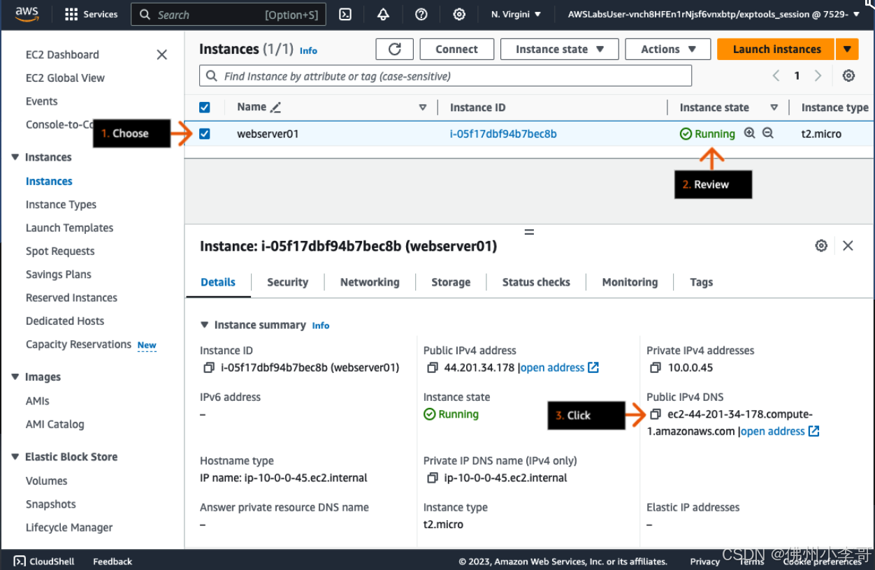 3. 将EC2起一个别名“webserver01”,选择操作系统Amazon Linux,镜像为“Amazon Linux 2 AMI”,选择实例类型t2.micro