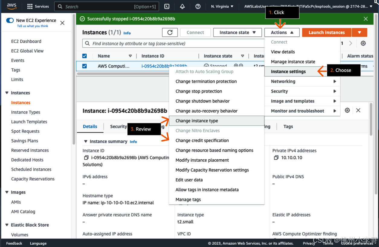 8. 需要注意的是,在EC2实例停止后,才能对EC2的部分配置进行修改,正在启动过程中部分参数(如实例类型大小)是不能修改的。