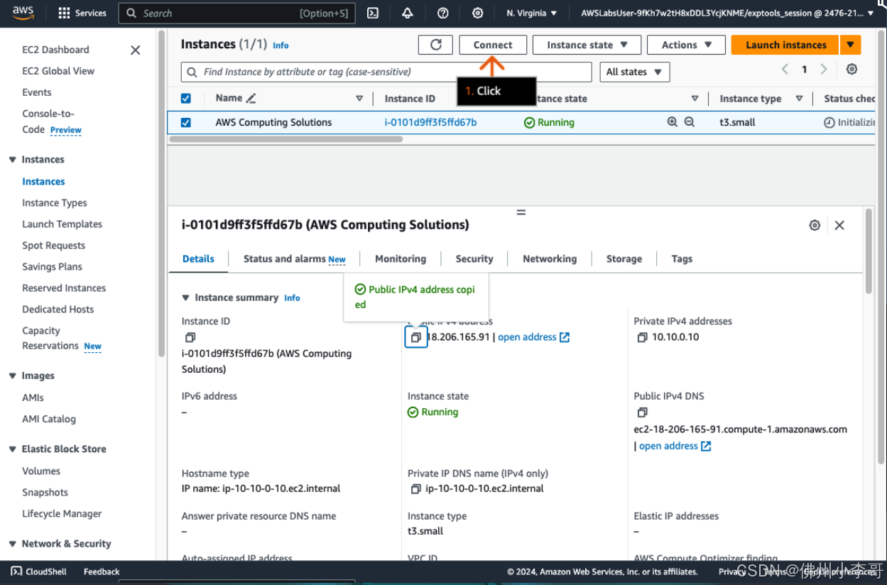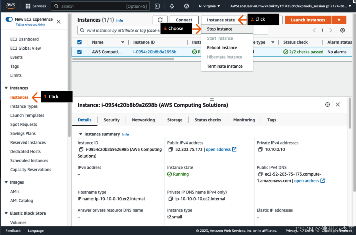 7. 在EC2控制台中,点击Instance State,对EC2实例进行关闭/开启/重启