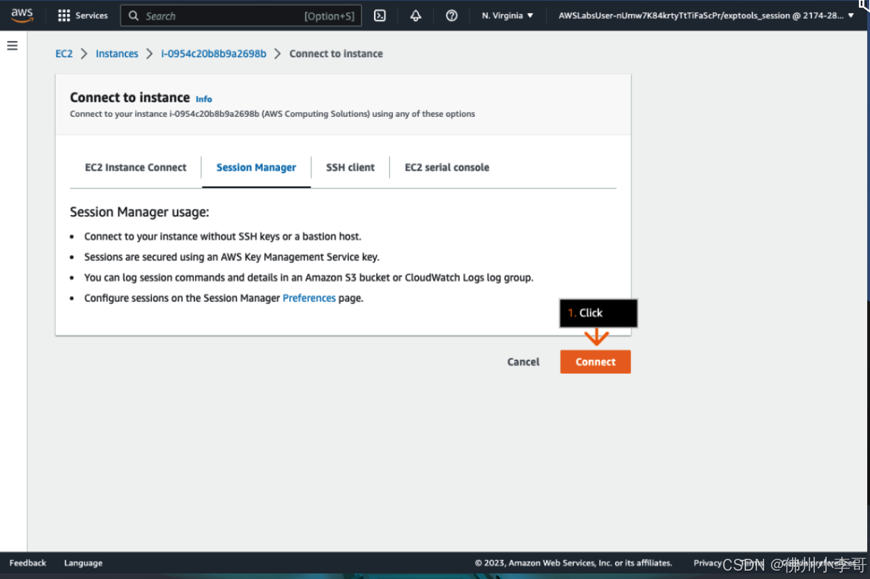 4. 再点击第二个选项Session Manager,并点击Connect通过SSH连接进入