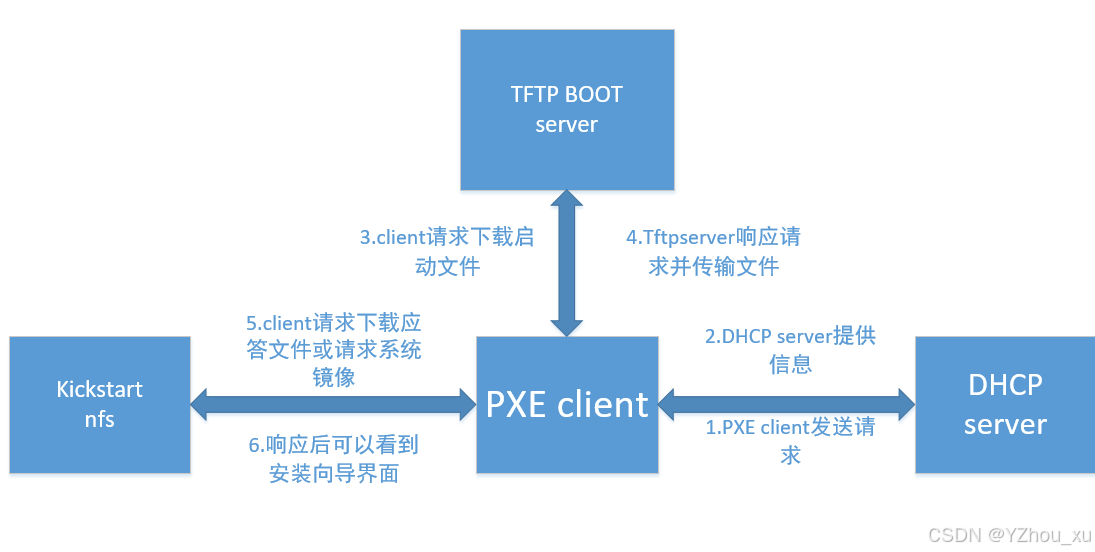 PXE(preboot execute environment,预启动执行环境)工作于Client/Server的网络模式,支持客户机通过网络从远端服务器下载镜像,并由此支持通过网络启动操作系统,在启动过程中,客户机要求服务器分配IP地址,再用TFTP(trivial file transfer protocol)协议下载一个启动软件包到本机内存中执行,由这个启动软件包完成客户机基本软件设置,从而引导预先安装在服务器中的终端操作系统。