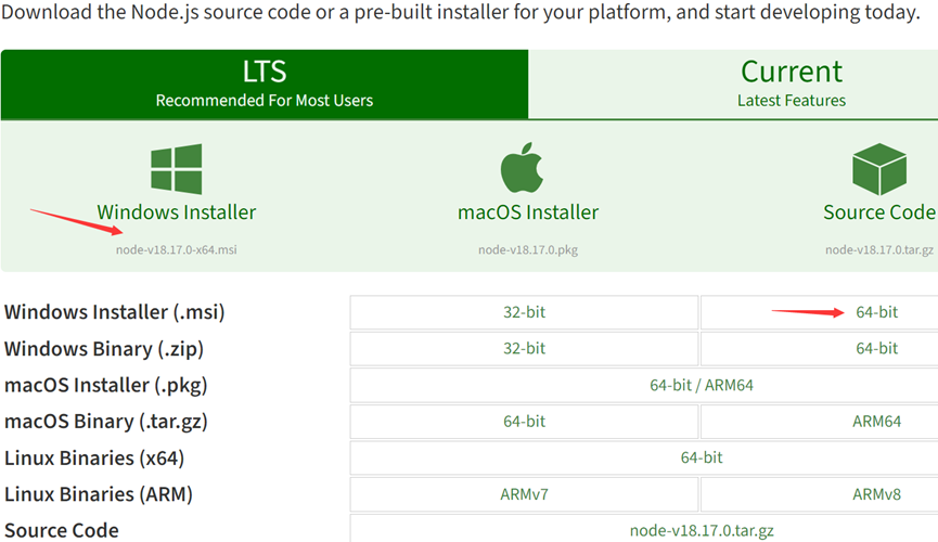 以windows为例,我们可以选择64-bit的Windows Installer (.msi)的Node.js安装程序。