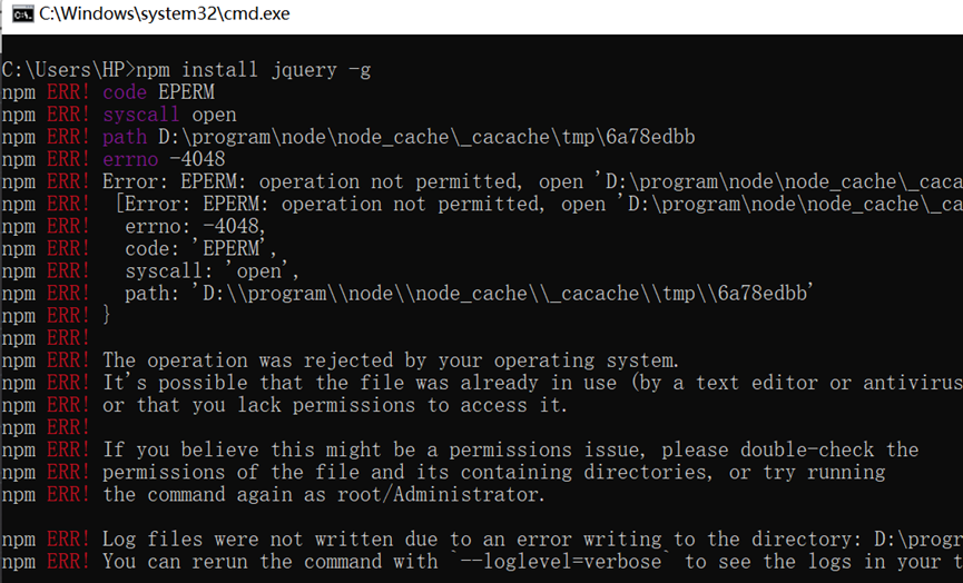 上面包的全局的安装路径和缓存路径是安装node.js完成后默认的路径,默认在c盘,考虑到占用空间问题,我们可以指定到其他盘,比如:D盘。由于C盘是系统盘,在win11系统中,c盘中的文件夹的安全允许权限一般能根据cmd命令行操作时的需求而确定,但d盘不是系统盘,我们在cmd命令行修改到d盘的全局的安装路径和缓存路径时,可能不能自动创建d盘文件夹及修改其安全允许权限,这时候用npm安装包,会提示npm ERR! Error: EPERM: operation not permitted,npm ERR! The operation was rejected by your operating system,如图4-4所示。