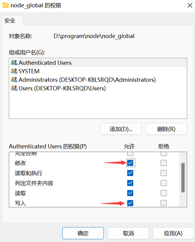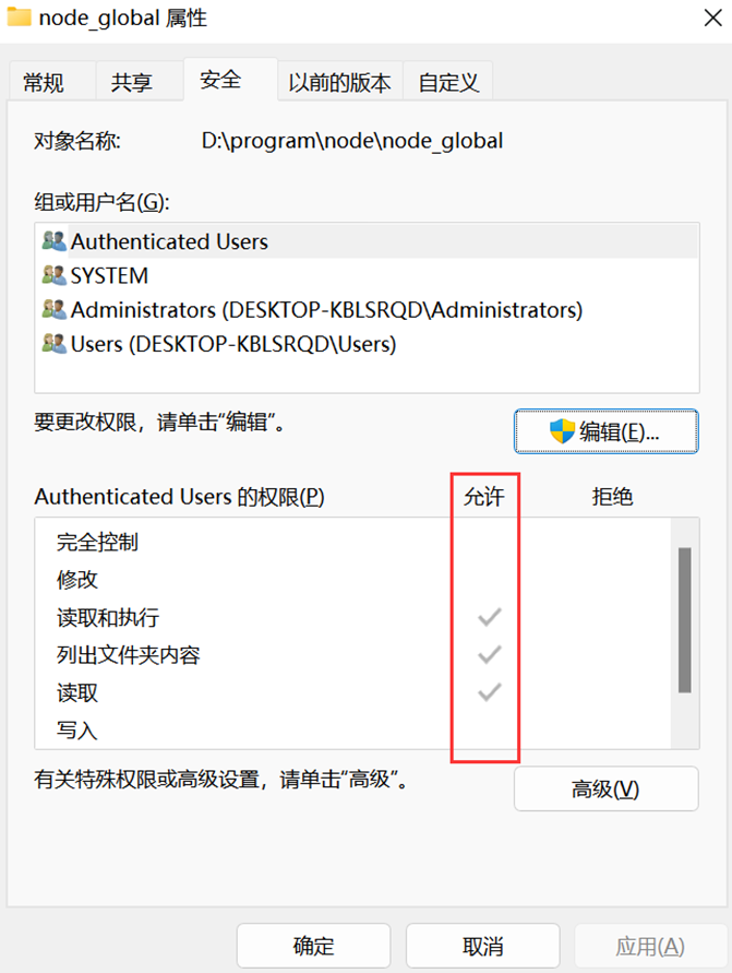 分别设置node_global和node_cache文件夹的安全允许权限,以便写入、修改文件夹中的内容,我们鼠标右键文件夹→属性→安全,如图4-6所示,其中,第三个文件夹node_modules为安装node时自动生成的,用来存放安装node.js时自动安装的内置模块(也称为标准包)。