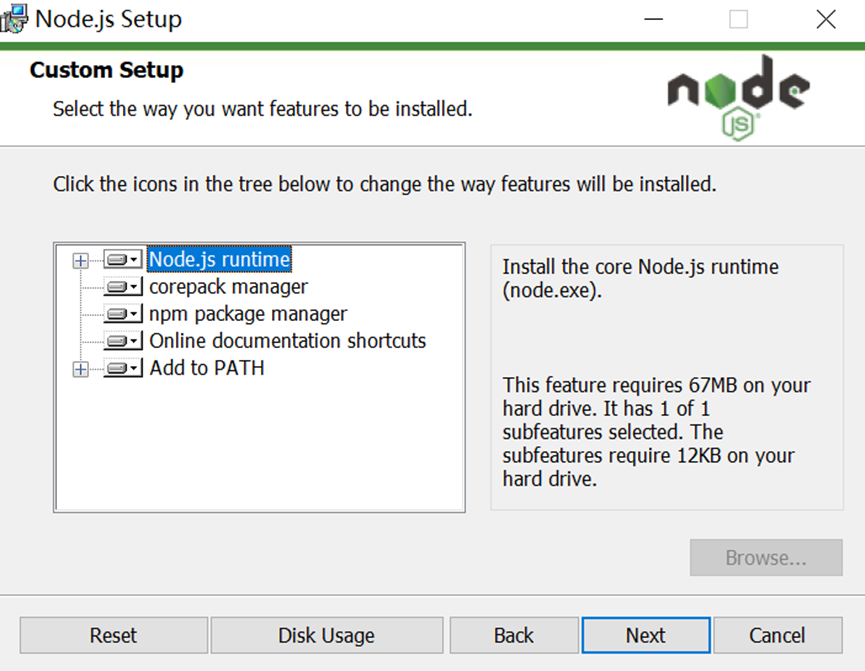 添加到Windows的环境变量。点击左侧+,出现它的subfeature(子功能):Node.js and npm 和npm modules(也即把Node.js、npm 、npm modules添加到环境变量,npm modules为由npm全局安装的模块或库(可以统称为包))。