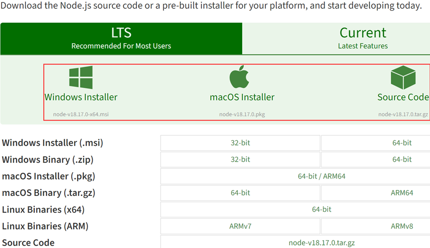 我们可以选择LTS下对应的Node.js程序。图2-2中提供了适合Windows、macOS、Linux系统的Node.js程序,图2-2中红框部分是默认的下载,红框下面是具体参数对应的下载。比如:红框中Windows的默认下载也实际是相当于红框下面的Windows Installer(.msi)→64-bit的下载。