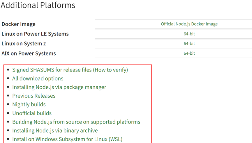 下载页面还提供了适合其它平台的Node.js,如图2-4中的Additional Platforms下的选项对应的下载。