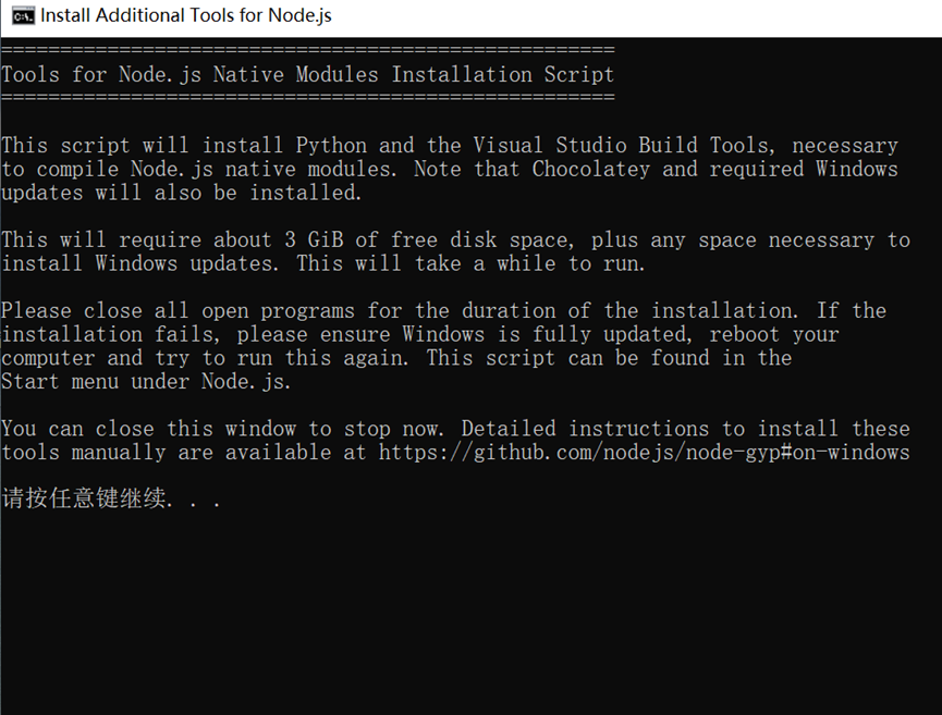 在图3-6中勾选Automatically install the necessary tools选项,会自动下载安装python和VS,也会安装Windows的Chocolatey包管理器。