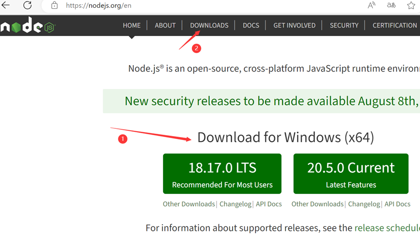 二、单击网站的Downloads,选择对应的系统下载Nodejs