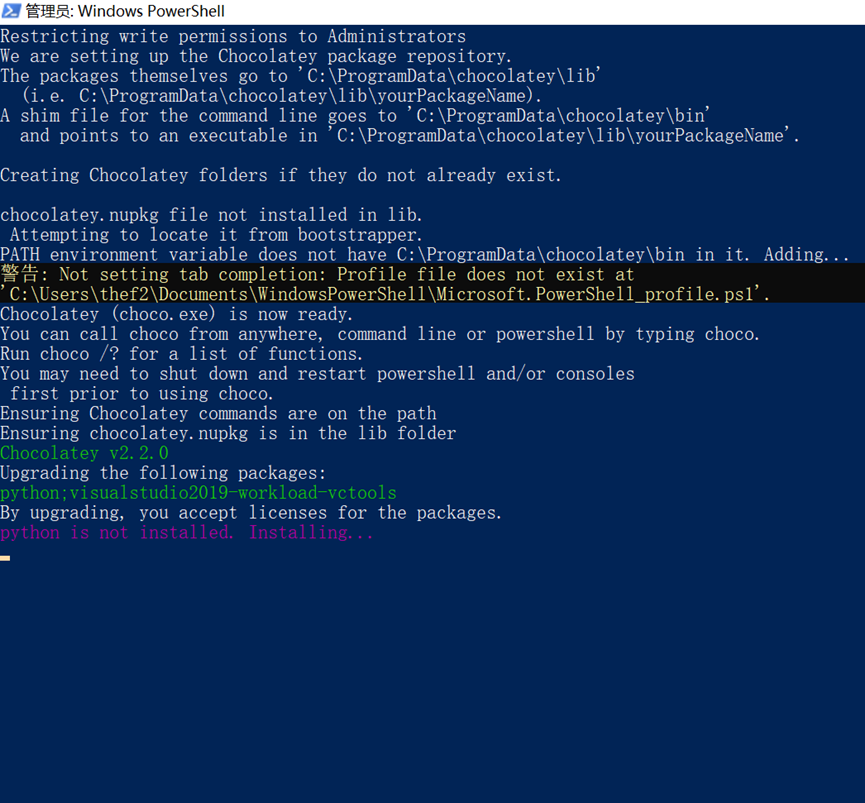 从图3-11中的提示可知,Chocolatey安装后,会自动下载并安装python、VS。当Chocolatey、python、VS安装完成后,可以关闭图3-11。