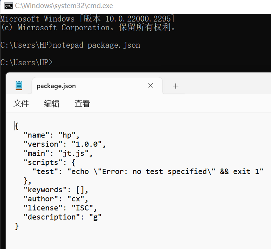 要在cmd.exe中编辑或查看package.json文件,可以使用命令notepad package.json,以文本编辑器打开package.json文件,如图5-2所示打开C:\Users\HP里的package.json文件,打开后就可以根据需要手动设置选项,保存即可。