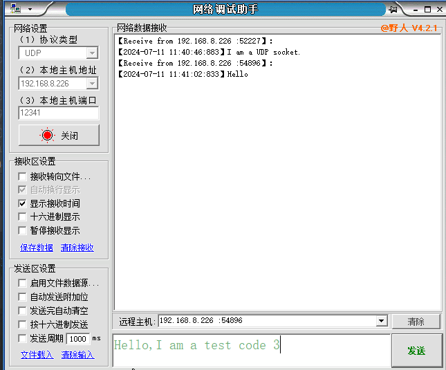 当前版本: 1.0.0 this is thread 1 running thread 1 第 1 次运行 this is thread 2 running thread 2 第 1 次运行 send 1 message [From 127.0.0.1:9999]:Hello,I am a UDP socket for: 1 thread 1 第 2 次运行 thread 2 第 2 次运行 send 2 message [From 127.0.0.1:9999]:Hello,I am a UDP socket for: 2 thread 1 第 3 次运行 thread 2 第 3 次运行 send 3 message [From 127.0.0.1:9999]:Hello,I am a UDP socket for: 3 thread 1 第 4 次运行 thread 2 第 4 次运行 send 4 message [From 127.0.0.1:9999]:Hello,I am a UDP socket for: 4 thread 1 第 5 次运行 thread 2 第 5 次运行 send 5 message 使用网络调试助手,测试程序