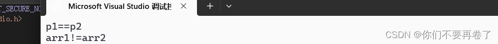 这说明p1和p2指向同一个字符a,字符串abcdef是常量字符串,放在内存中的只读内存区,不能改变它的值,没有必要存在多份,只在内存中存一份,所以p1和p2都指向a的地址,p1就等于p2.而arr1和arr2不相等,是因为arr1[ ]和arr2[ ]是两个独立的数组,,每一个都在内存中开辟了一份独立的空间,所以地址肯定是不相同的。