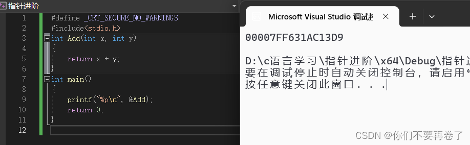 由此可见打印出来的值就是Add函数的地址。对于函数来说,&函数名和函数名都是函数的地址