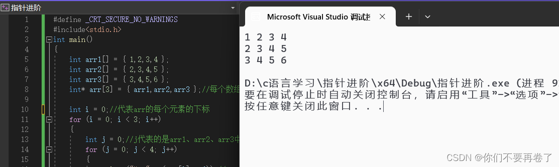 #include int main() { int arr1[] = { 1,2,3,4 }; int arr2[] = { 2,3,4,5 }; int arr3[] = { 3,4,5,6 }; int* arr[3] = { arr1,arr2,arr3 };//每个数组的首元素地址,每个元素的类型是int* int i = 0;//代表arr的每个元素的下标 for (i = 0; i < 3; i++) { int j = 0;//j代表的是arr1、arr2、arr3中每个元素的下标 for (j = 0; j < 4; j++) { printf("%d ", *(arr[i] + j));//arr[i]代表各个数组的数组名,即每个数组的首元素地址,加上j并解引用就拿到了所有元素 //因为*(p+i)等价于arr[i],所以有可以写成这样的形式 //printf("%d ",*(*(arr+i)+j));或者 //printf("%d ",arr[i][j]); } printf("\n"); } return 0; }