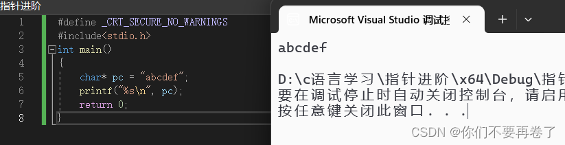 这里需要注意pc里面放的并不是整个字符串,而是a的地址,非要放在pc(4字节)中是放不下的,而打印的是字符串(%s),我们只要知道首字符a的地址就能向后访问得到整个字符串的地址在char* 前面加上const会更加好一些。看这样一道题:
