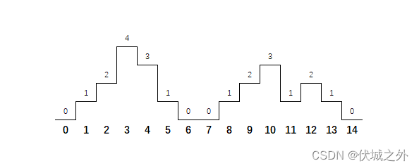 例如:[0,1,2,4,3,1,0,0,1,2,3,1,2,1,0],代表如下图所示的地图,地图中有两个山脉位置分别为 1,2,3,4,5 和 8,9,10,11,12,13,最高峰高度分别为 4,3。最高峰位置分别为3,10。