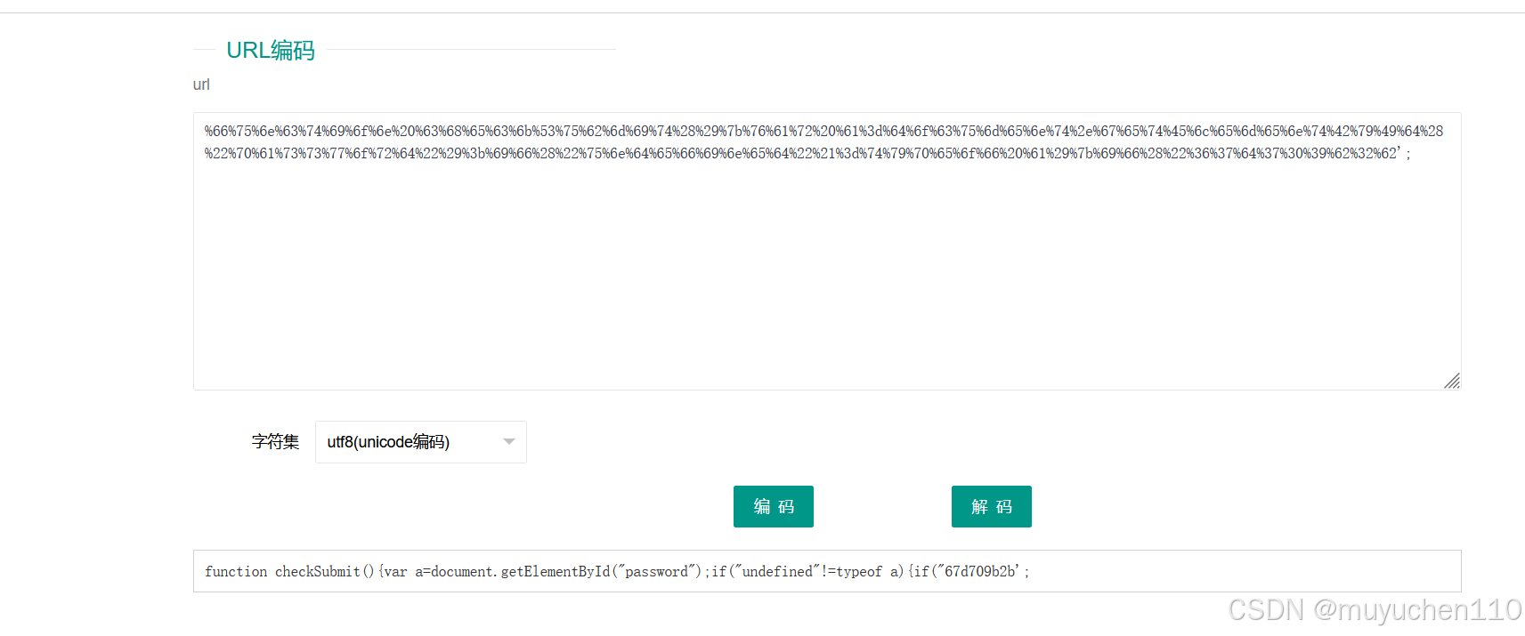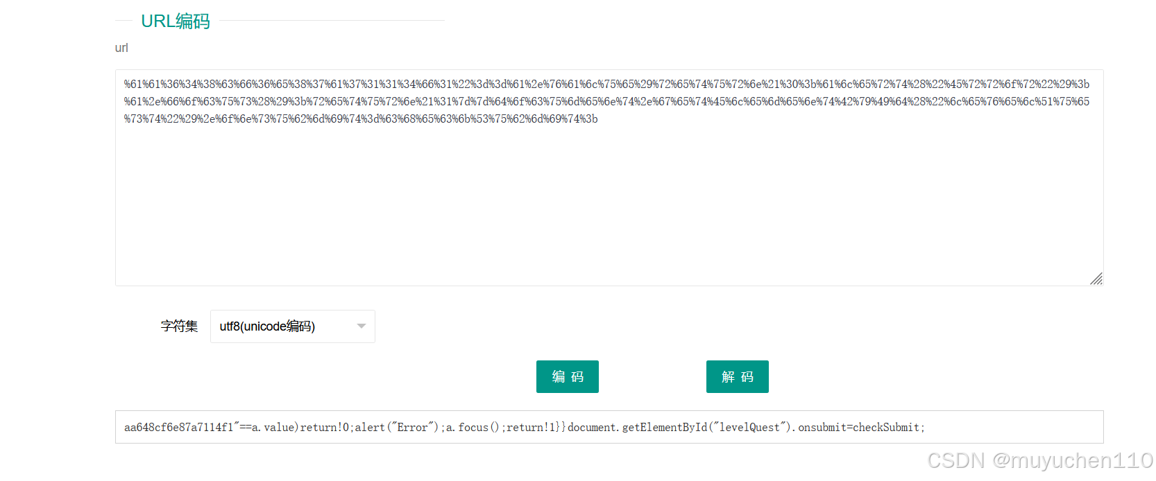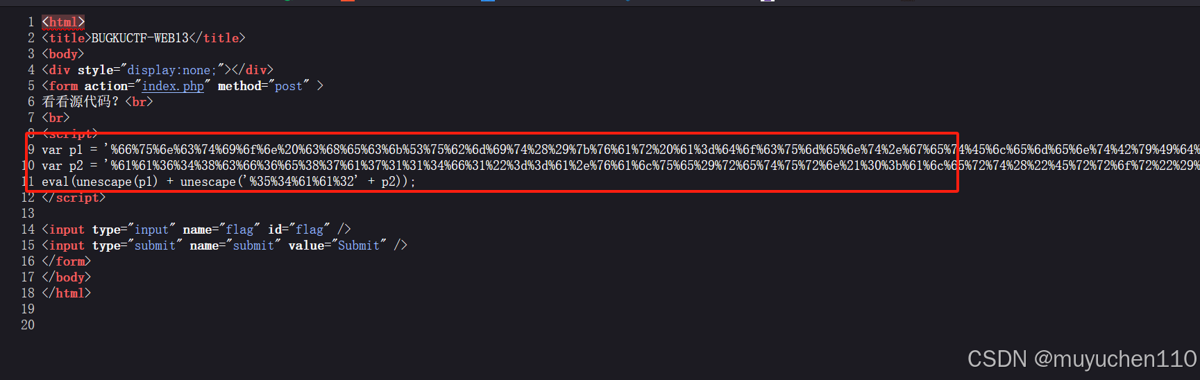 eval(unescape(p1) + unescape('54aa2' + p2));这段代码将p1,54aa2和p2字符串拼接并将其作为JavaScript 代码进行执行。因此我们得到最后的代码:67d709b2b54aa2aa648cf6e87a7114f1