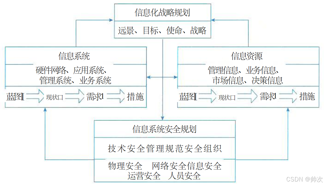 规划工作需要围绕着信息系统与信息资源的开发、利用和保护工作进行,要包括蓝图、现状、需求和措施4个方面。
