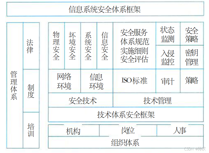 从上图可以看出,信息系统安全体系主要是由技术体系、组织机构体系和管理体系三部分共同构成的。