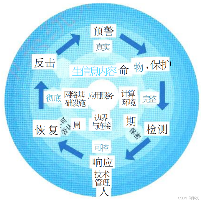 WPDRRC(Waring/Protect/Detect/React/Restore/Counterattack) 信息安全模型是我国“八六三”信息安全专家组提出的适合中国国情的信息系统安全保障体系建设模型。WPDRRC 模型有6个环节和3大要素。