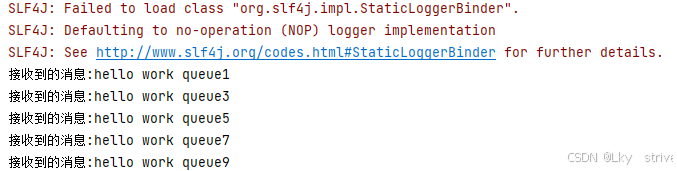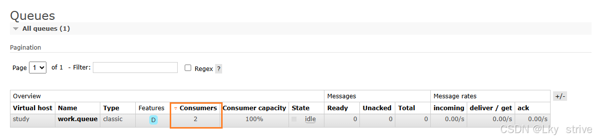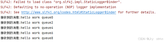public class Producer { public static void main(String[] args) throws IOException, TimeoutException { //1. 建立连接 ConnectionFactory connectionFactory = new ConnectionFactory(); connectionFactory.setHost(Constant.HOST); connectionFactory.setPort(Constant.PORT); //需要提前开放端口号 connectionFactory.setUsername(Constant.USER_NAME); //账号 connectionFactory.setPassword(Constant.PASS_WORD); //密码 connectionFactory.setVirtualHost(Constant.VIRTUAL_HOST); //虚拟主机 Connection connection = connectionFactory.newConnection(); //2. 开启信道 Channel channel = connection.createChannel(); //3. 声明队列 使用内置交换机 //如果队列不存在,则创建,如果队列存在,则不创建 channel.queueDeclare(Constant.WORK_QUEUE,true,false,false,null); //4. 发送消息 for (int i = 0; i < 10; i++) { String msg = "hello work queue" + i; channel.basicPublish("",Constant.WORK_QUEUE,null,msg.getBytes()); } System.out.println("消息发送成功"); //6. 释放资源 channel.close(); connection.close(); } }