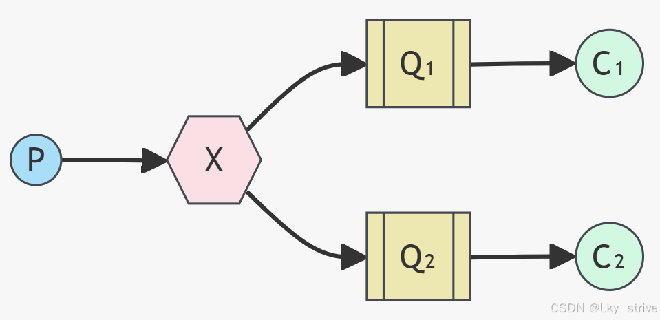 Publish/Subscribe 模式中,一个生产者 P,多个消费者 C1,C2,X 代表交换机消息复制多分,每个消费者接收相同的消息