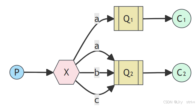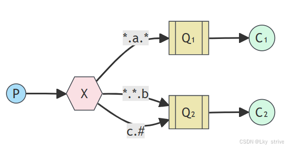 例如,打印日志,日志的等级为 error、warning、info、debug,就可以通过这种模式,把不同的日志发送到不同的队列