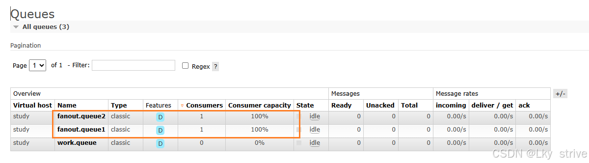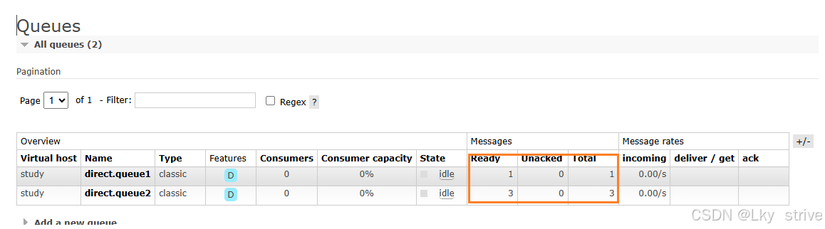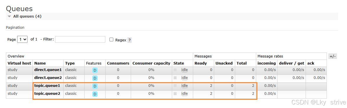 可以看到队列 1 里面有一条消息,队列 2 里面有 3 条消息,符合路由模式