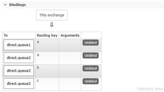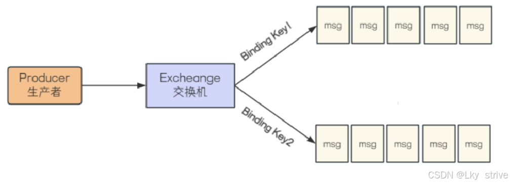 例如当 RoutingKey 为 Bining Key1 时,消息就会路由到第一个队列,为 Binding Key2 时,消息路由到第二个队列