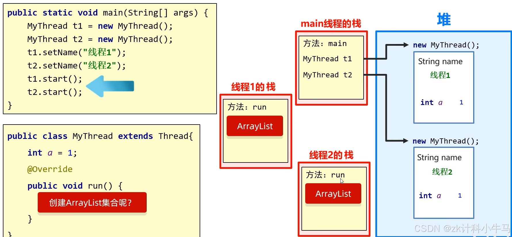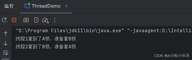 public class MyThread extends Thread { static Object objA = new Object(); static Object objB = new Object(); @Override public void run() { //1.循环 while (true) { if ("线程1".equals(getName())) { synchronized (objA) { System.out.println("线程1拿到了A锁,准备拿B锁");//线程1卡在这里 synchronized (objB) { System.out.println("线程1拿到了B锁,顺利执行完一轮"); } } } else if ("线程2".equals(getName())) { if ("线程2".equals(getName())) { synchronized (objB) { System.out.println("线程2拿到了B锁,准备拿A锁");//线程2卡在这里 synchronized (objA) { System.out.println("线程2拿到了A锁,顺利执行完一轮"); } } } } } } }