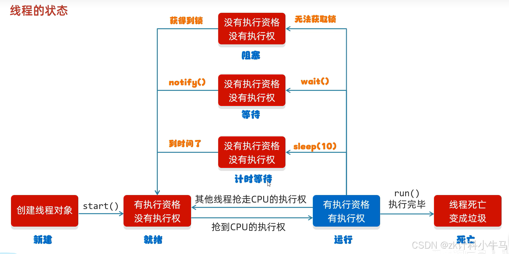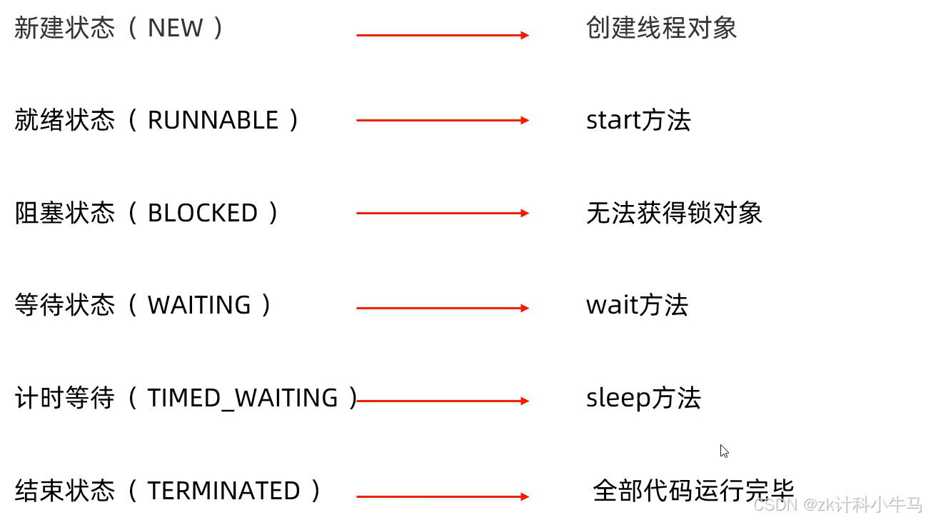 严格的来说,线程有7种状态,但是线程在进入要运行阶段的时候,JVM直接将线程丢给操作系统,java就不管了。所以对于java来说,线程是有6种状态。如下,