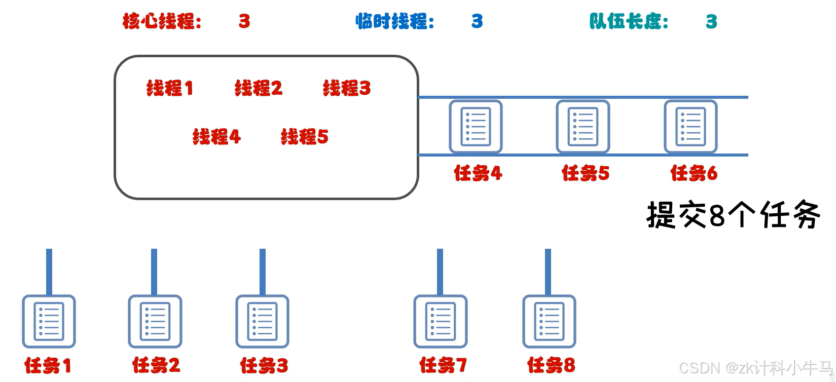 A.线程池的参数如下,提交的任务数小于3+3+3,因此不会触发任务过多解决方案,8个任务从核心线程开始放,然后放队伍,发现不够放了,于是找来临时工(临时线程)放多余的两个任务。