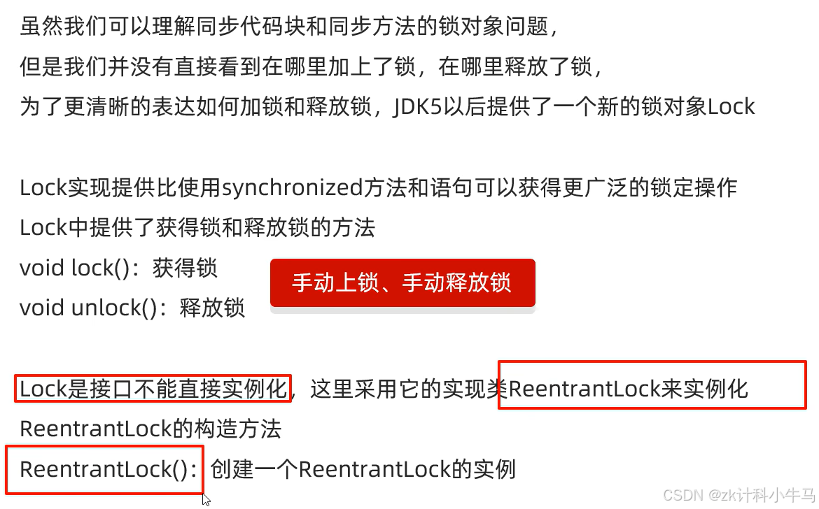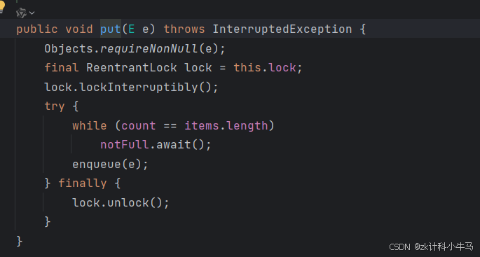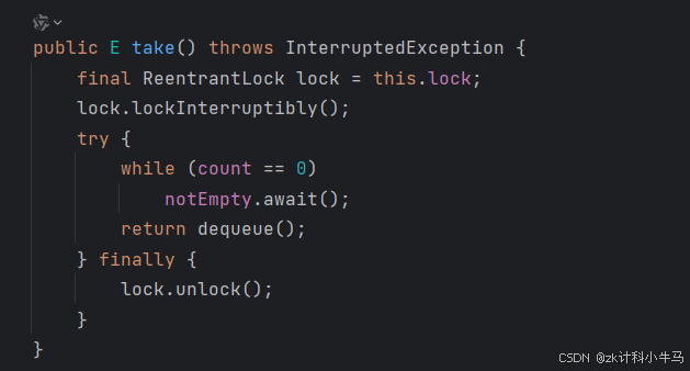 注意:锁只在阻塞队列里面,即示例代码的put和take方法里面