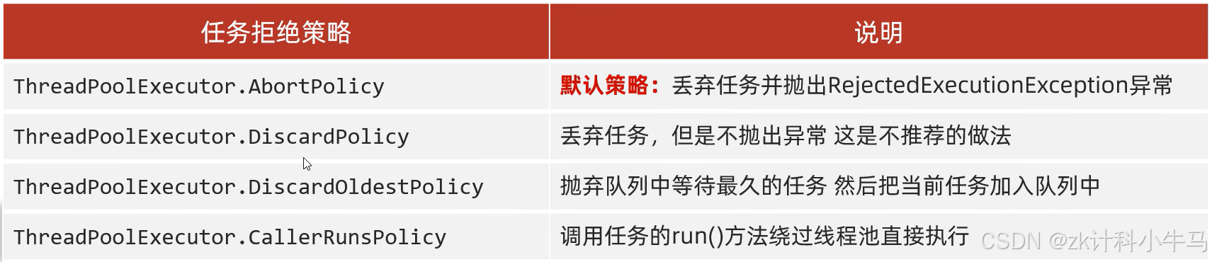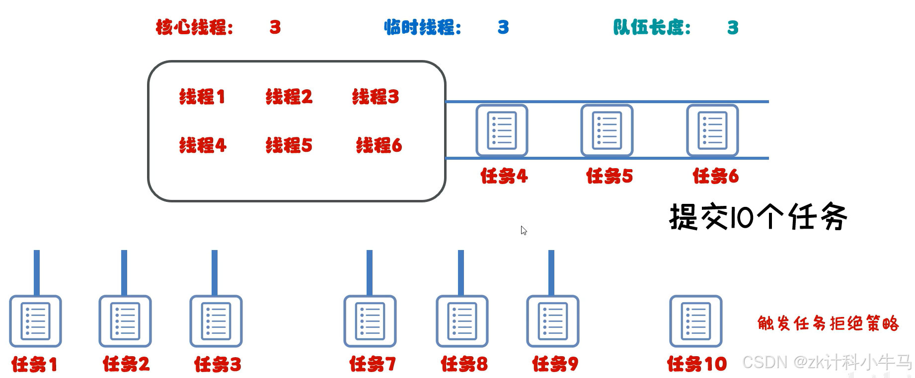 B.下面这种情况和上面不同的是,提交的任务数量超过了3+3+3,于是最后一个任务触发了任务拒绝策略。 其他和上面相同